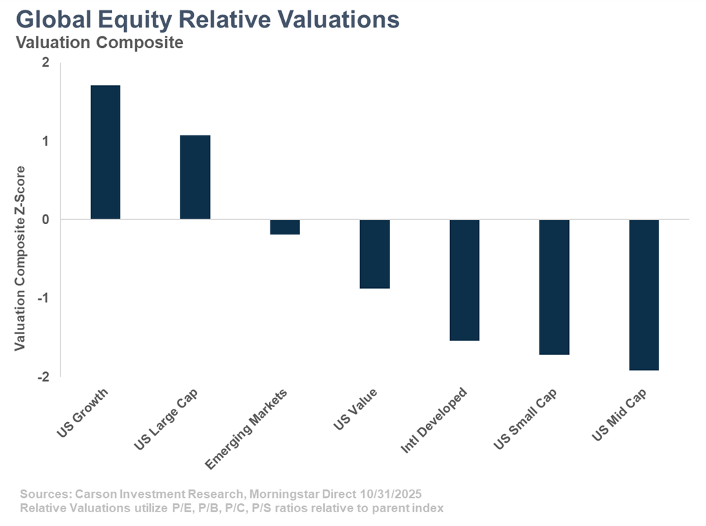 The recent drawdown from all-time highs (-5% intraday at the time of this writing) has done nothing to tarnish a great year for broad equity markets. With any strong run in the market, examining where valuations end up as a result is a worthwhile exercise. Often, price appreciation is warranted on the back of strong earnings growth and fundamentals – something we are no doubt seeing today. As third-quarter earnings season comes to a close, 82% of companies have beaten expectations and the year-over-year growth rate is more than 13% (according to FactSet)! Those are fantastic numbers, yet despite the strong earnings growth we still see valuations for certain segments of the market at elevated levels. Having a broadly diversified portfolio that’s not “all in” on more expensive parts of the markets helps to provide balance going forward.