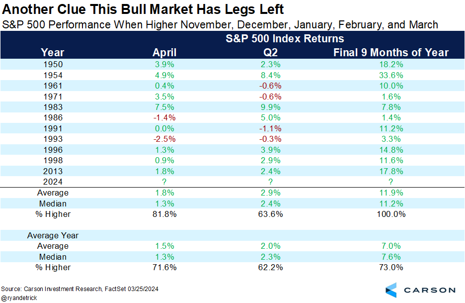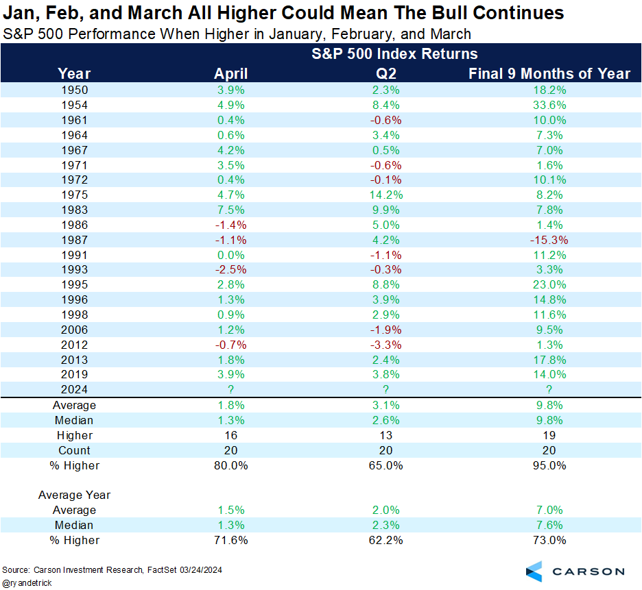 Let’s not forget stocks soared in November and December as well, so they are up five months in a row heading into the usually bullish month of April. Sure enough, stocks tended to do better in April and Q2 after such long win streaks. Lastly, the rest of the year (so the final nine months) have never been lower when there has been at least a five-month win streak heading into April. 💪