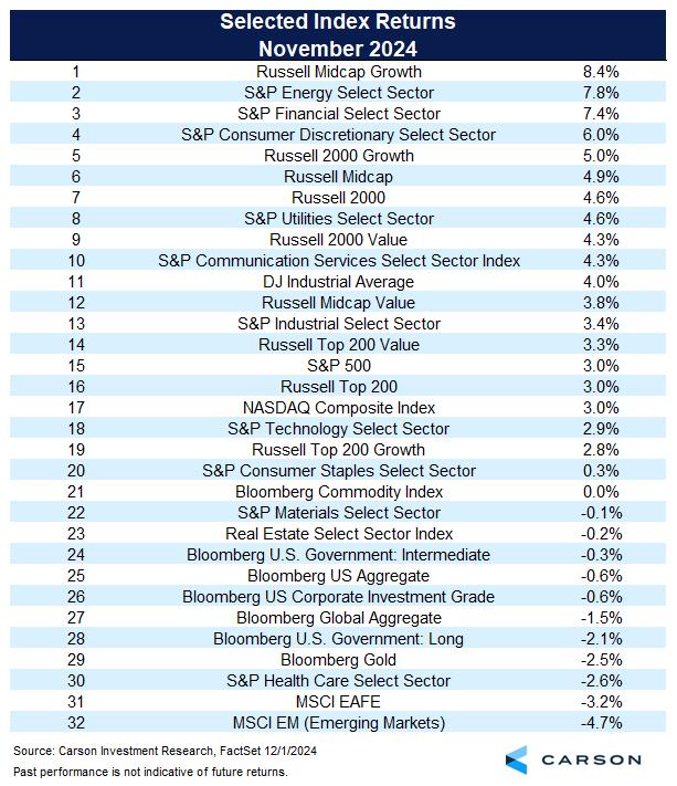 November was a huge month, but it was also very broad-based strength. The big winner though? It was small caps. The table below we share with our Carson Partners and shows just how strong last month indeed was.