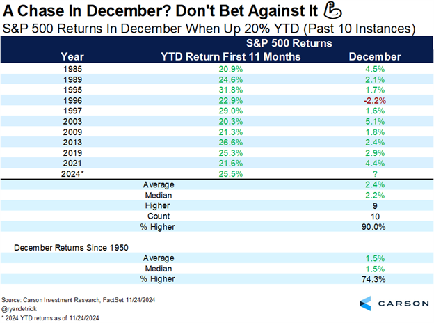 As I noted last week, when the S&P 500 was up 20% or more for the year heading into the final month, December has been up nine of the past 10 times.