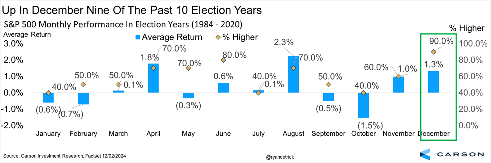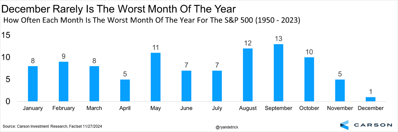 The worst month this year was about a 4% drop in April. Here’s the good news … It is quite rare for December to be the worst month of the year, as that has happened only once in history. By the way, that was in December 2018 when the market threw a big fit after the Fed didn’t cut rates. Bottom line, now isn’t the time to be expecting a big drop.