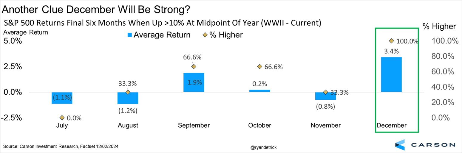 Good friend Tom Lee, Founder of Fundstrat, mentioned on CNBC on Monday morning that when the S&P 500 was up at least 10% at the midpoint of an election year, December has never been lower. Sure enough, that is true.