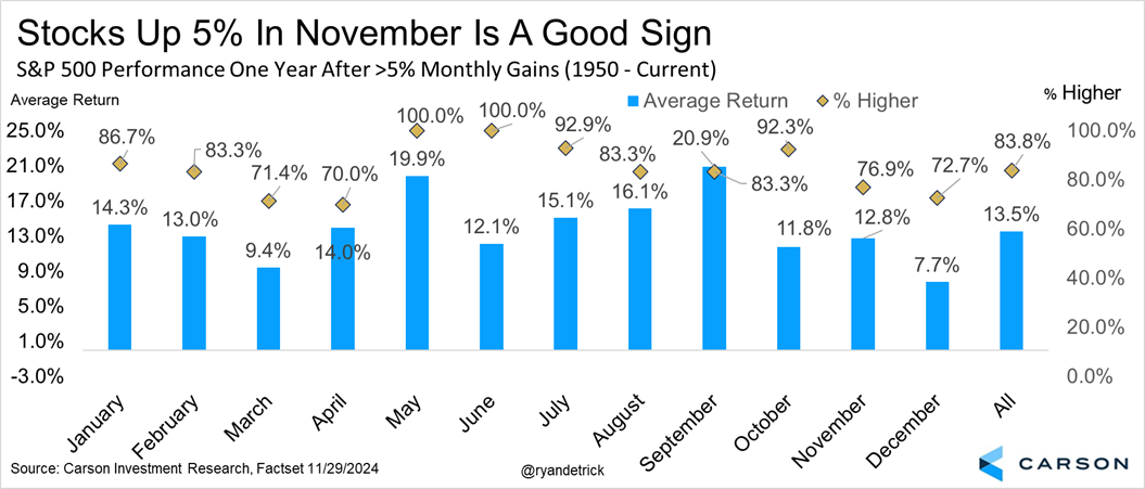 November just had a huge gain, up more than 5% in fact, for the best monthly return since November 2023. Do big monthly gains matter? We’d say yes, as the S&P 500 is up an average of 13.5% a year later and higher nearly 84% of the time after a calendar month gain of more than 5%. Breaking it down by month, after a 5% or gain in November, the next year is up almost 13% on average and higher nearly 77% of the time, both better than your average yearly return.