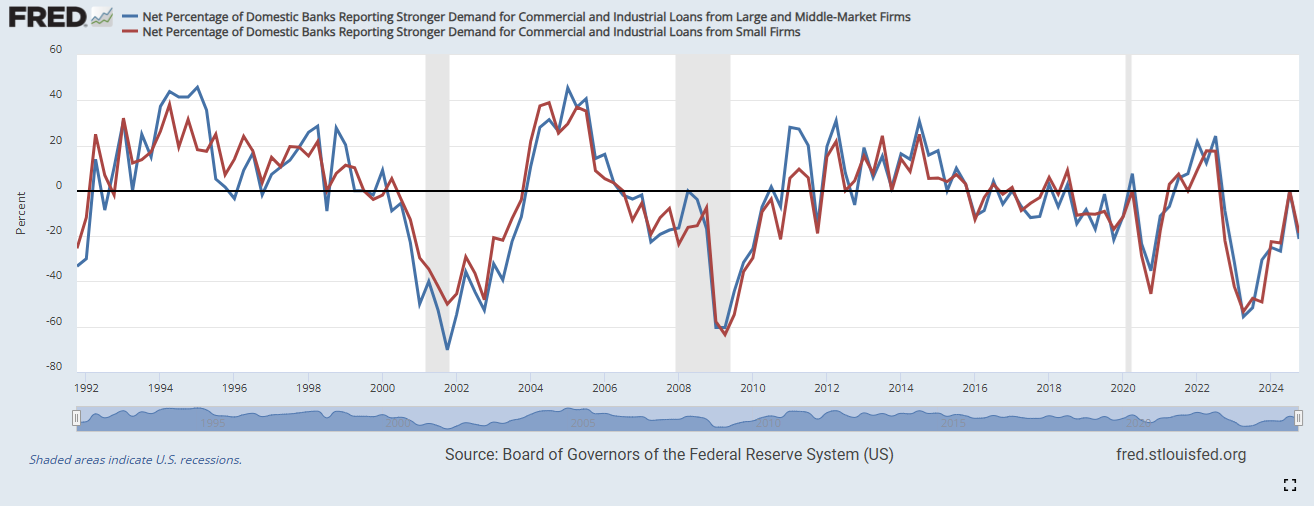 This is further confirmation that the inflation problem is over, and the Fed can normalize interest rates (and should do so). Elevated rates are clearly having a negative impact on rate-sensitive segments of the economy, especially housing. The Fed’s latest survey of bank loan officers also showed much weaker demand for loans in Q3, despite a pullback in the net number of banks tightening standards. The net percent of banks reporting stronger demand for commercial and industrial loans pulled back from 0% to -21% for large and middle-market firms, and from 0% to -19% for small firms. This is not what you want to see if investment spending is to pick up.