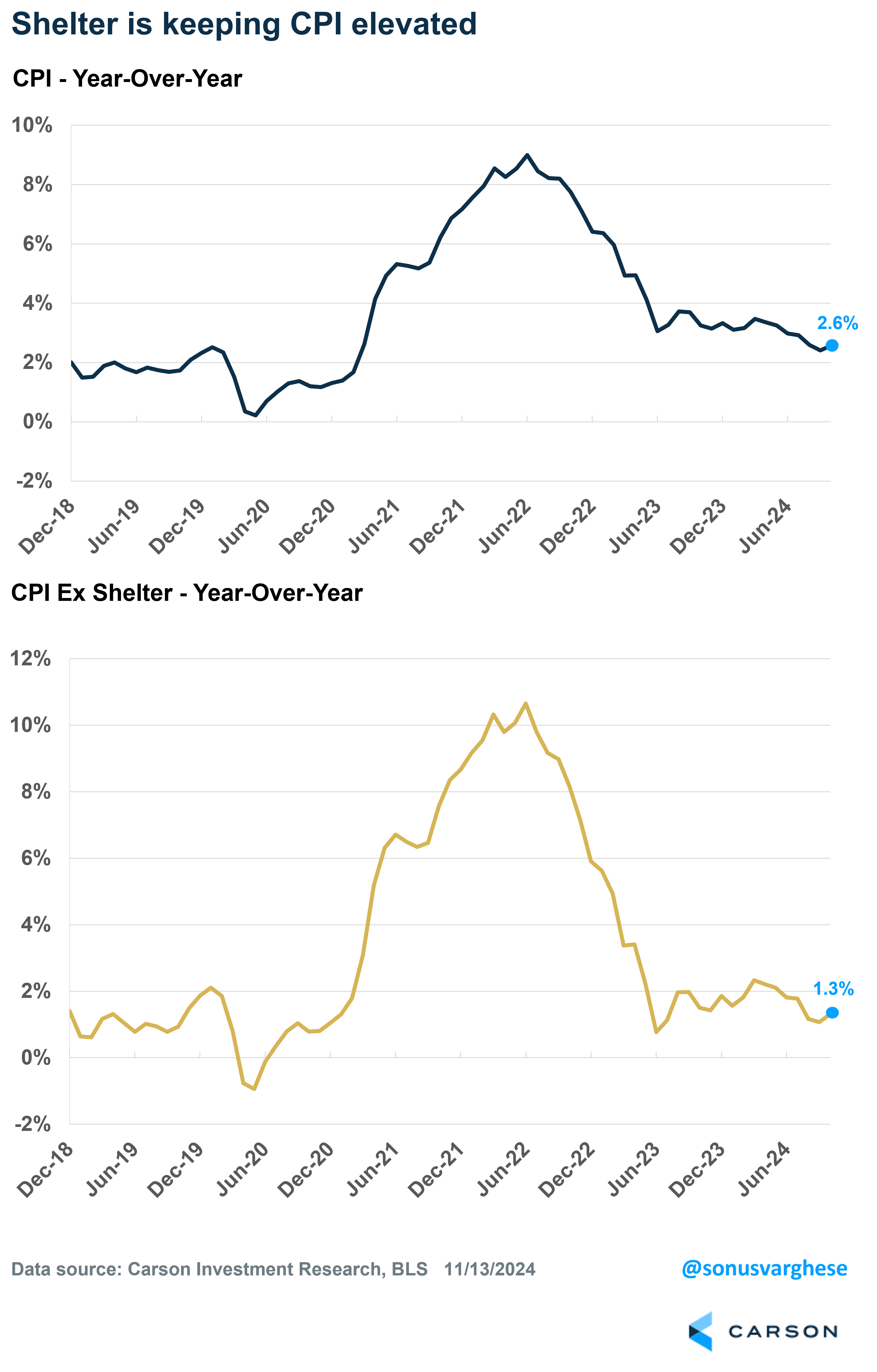 In short, the Fed doesn’t want the labor market to get weaker. Their most recent unemployment rate projections (from the September meeting) confirm this – they projected the 2024 and 2025 unemployment rate to remain steady at 4.4% (it’s currently at 4.1%). As I wrote back then, the Fed is essentially putting a cap on the unemployment rate, or rather, a floor under the economy. Crucially, the fact that inflation has normalized is what allows them to do this. There’s good reason to think this dynamic will play out in 2025 as well, with shelter disinflation in the pipeline and continuing to put downward pressure on overall inflation.