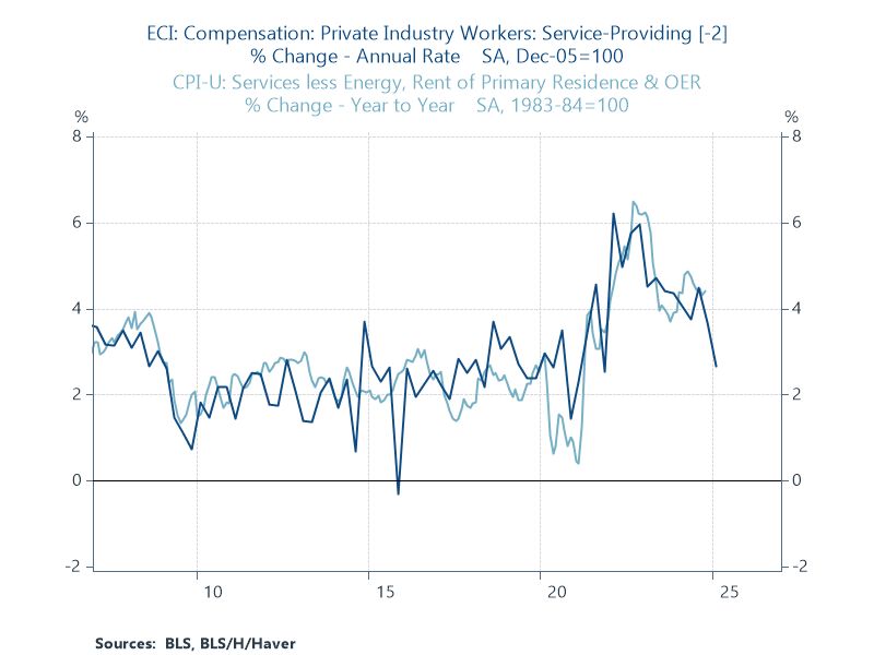 To Powell’s point, the labor market does not need to cool further for them to achieve their inflation mandate. And it had cooled quite a bit, as Neil Dutta at Renaissance Macro Research points out. A good place to see this is in wage growth. The latest Employment Cost Index data for private sector service industry workers showed wages growing 3.6% since last year but slowing to a 2.7% annualized pace in Q3. This metric is historically correlated with services inflation, and it looks like there’s further moderation ahead.