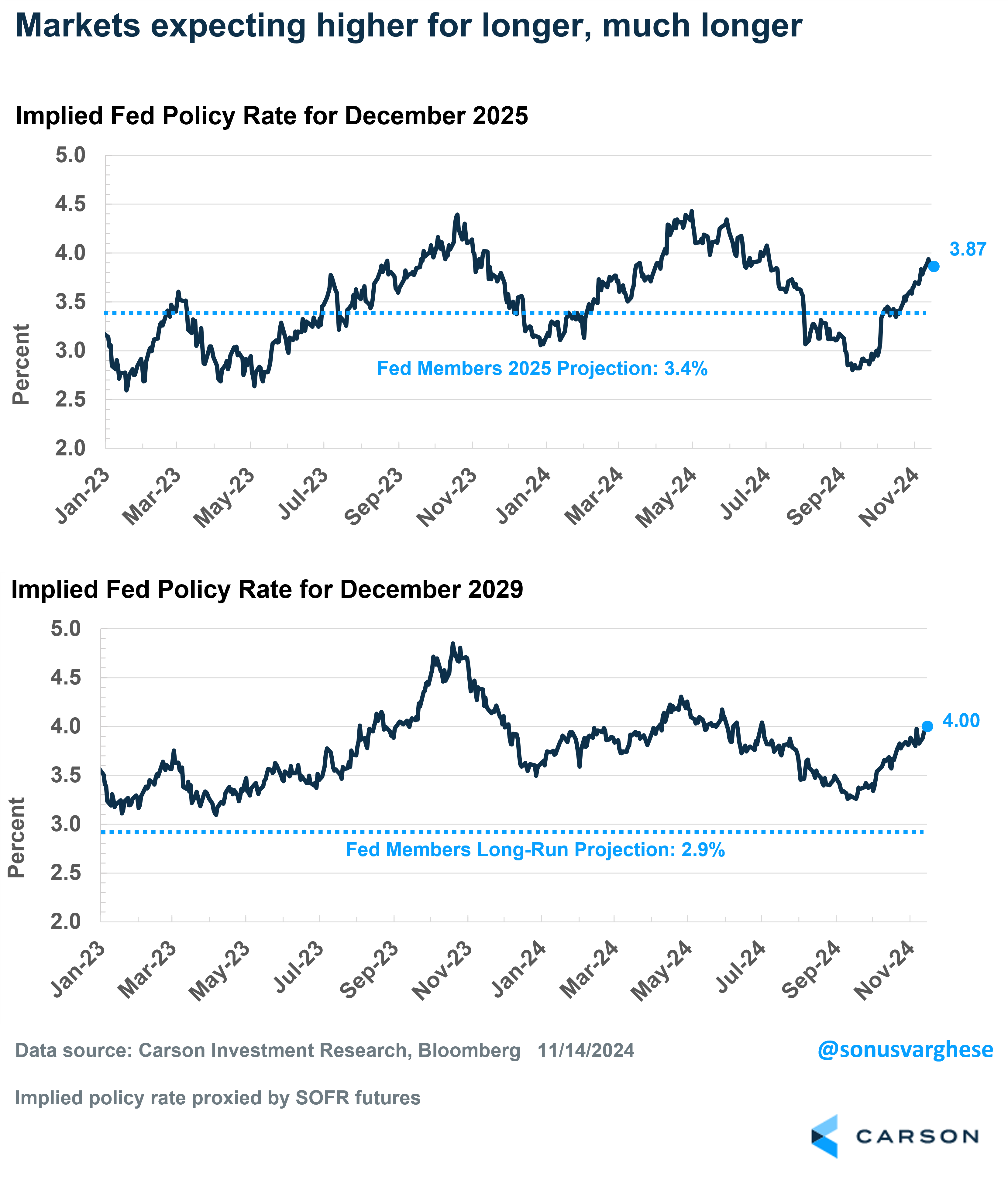 What’s interesting is that markets are now more hawkish than the median Fed member. Markets currently expect the policy rate to land around 3.9% at the end of 2025, implying just 2-3 more rate cuts. Fed members estimated the 2025 rate at 3.4% in their September projections. Looking further out into 2029, markets expect the policy rate to remain close to 4%. That’s well above the Fed’s long-run estimate of just 2.9%. At some point these divergent views will have to reconcile, and it may take investors becoming a tad less optimistic about future growth and perhaps Fed members becoming a tad more optimistic.