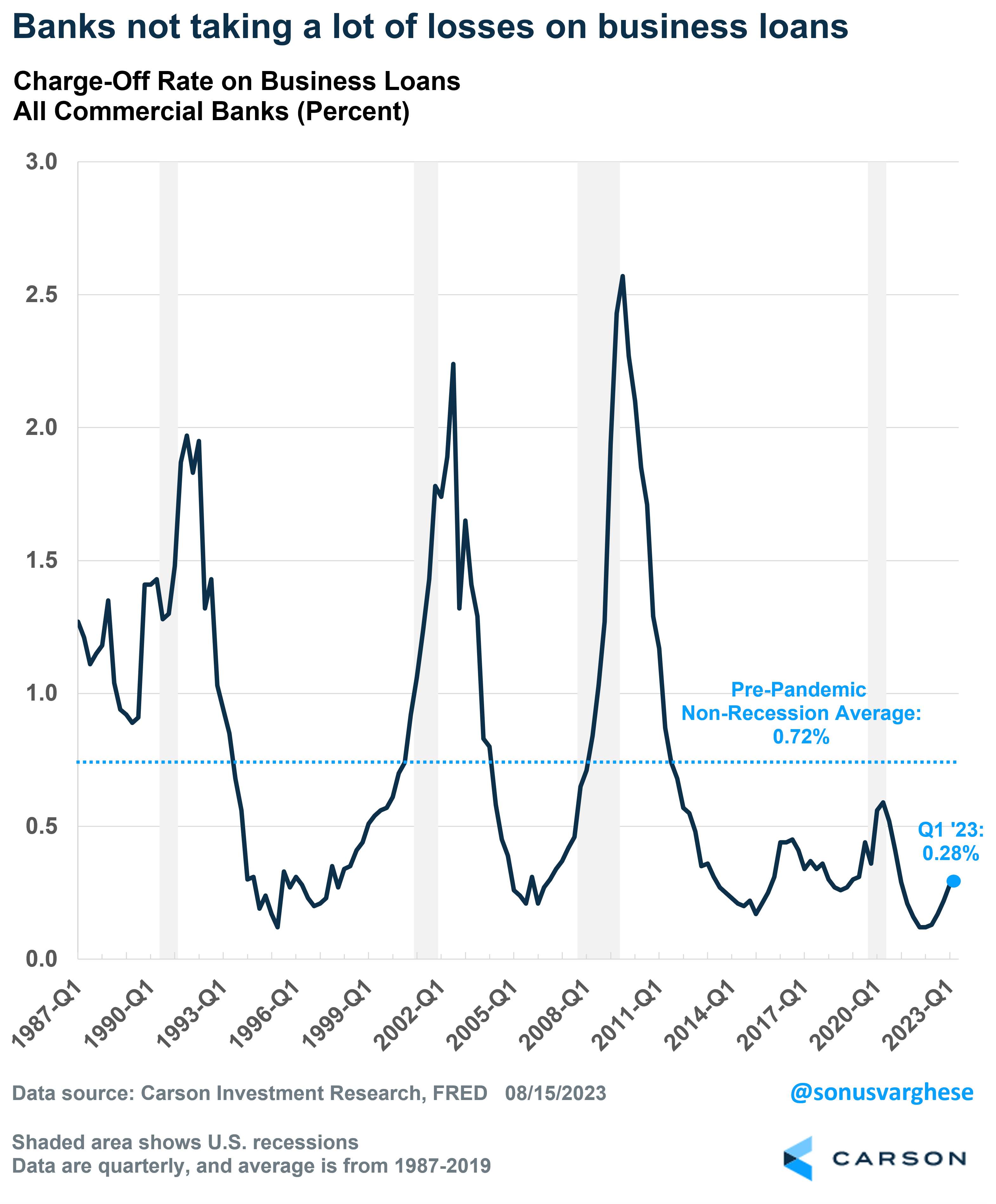 The Federal Reserve also collects “charge-off” data from all commercial banks – these are losses on loans that a bank recognizes, after they consider any recovery on defaulted loans. As a percent of average loans outstanding over a quarter, the “charge-off rate” in the first quarter was just 0.28%. This is obviously lagging data but that’s still well below the pre-pandemic non-recessionary average of 0.72%. We’re a long way below that right now.