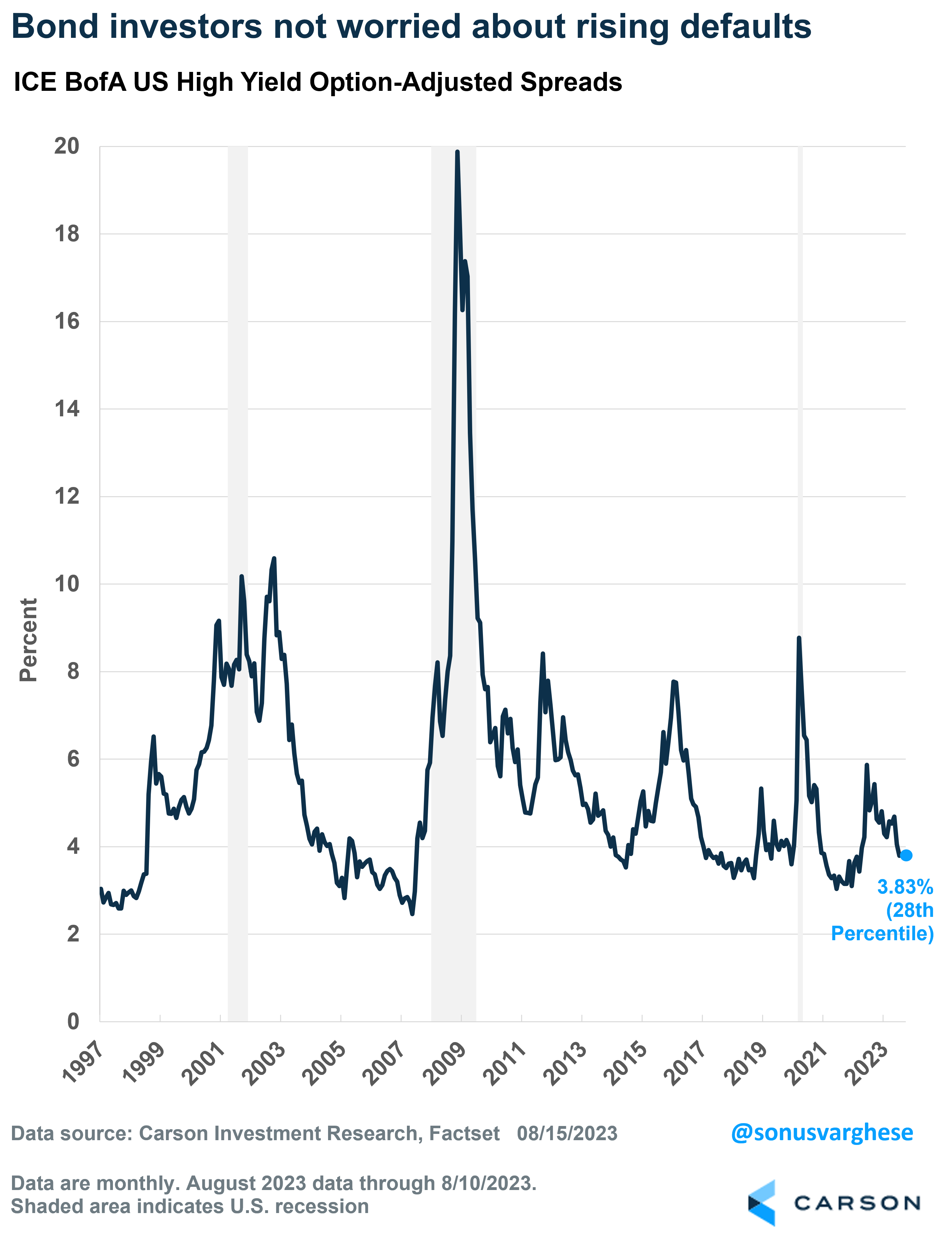 One way to monitor this to look at spreads for “high-yield” borrowers. These spreads represent the interest rate premium that companies rated below investment-grade companies have to pay over risk-free Treasury interest rates.